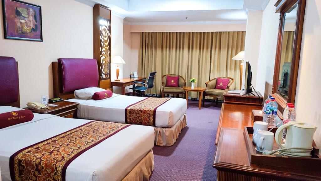 Kamar Executive Standard kami seluas 27 m², menawarkan kenyamanan pengalaman menginap anda. Pilihan tempat tidur Double Bed atau Twin Bed, sofa yang nyaman, kursi, meja tulis.